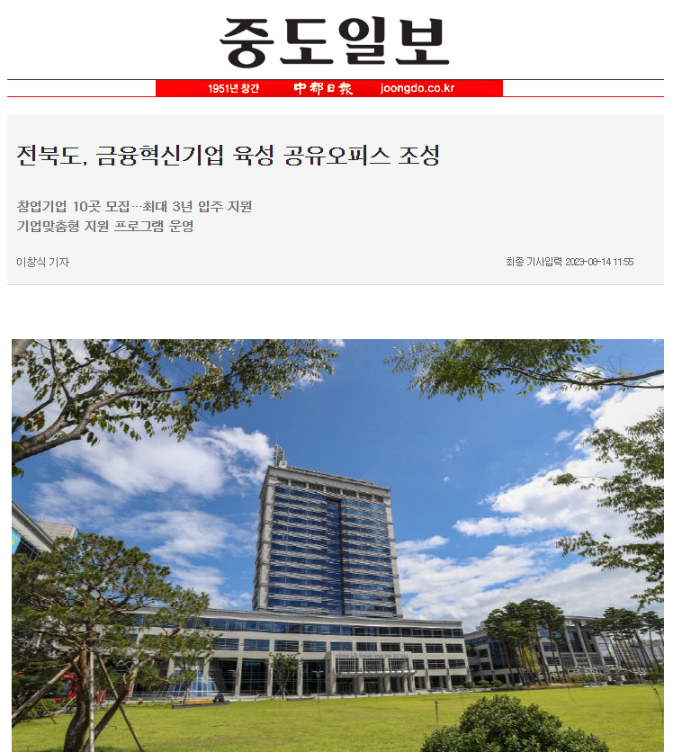 [중도일보] 전북도, 금융혁신기업 육성 공유오피스 조성(2023.08.14.)