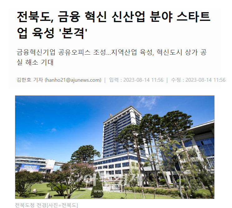 [아주경제] 전북도, 금융 혁신 신산업 분야 스타트업 육성 '본격'(2023.08.14.)