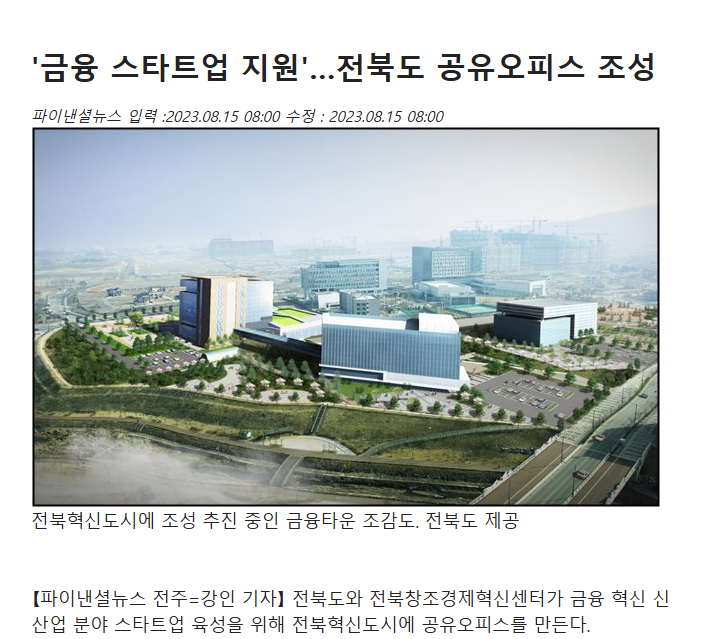 [파이낸셜뉴스] '금융 스타트업 지원'…전북도 공유오피스 조성(2023.08.15.)