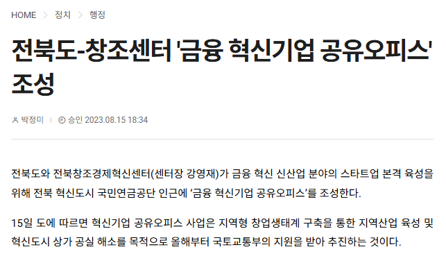 [전북중앙] 전북도-창조센터 '금융 혁신기업 공유오피스' 조성(2023.08.15.)