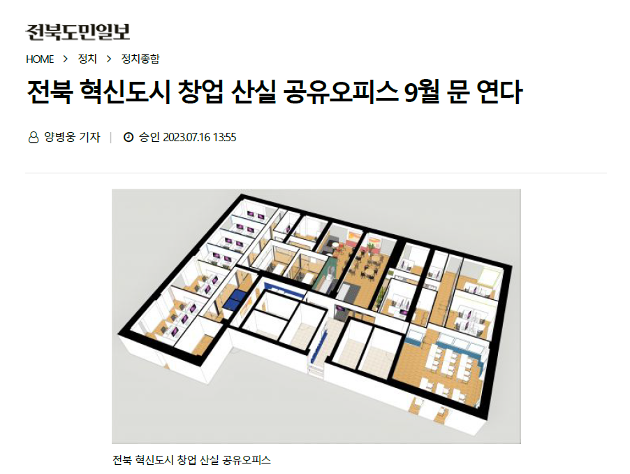 [전북도민일보] 전북 혁신도시 창업 산실 공유오피스 9월 문 연다(2023.07.16.)