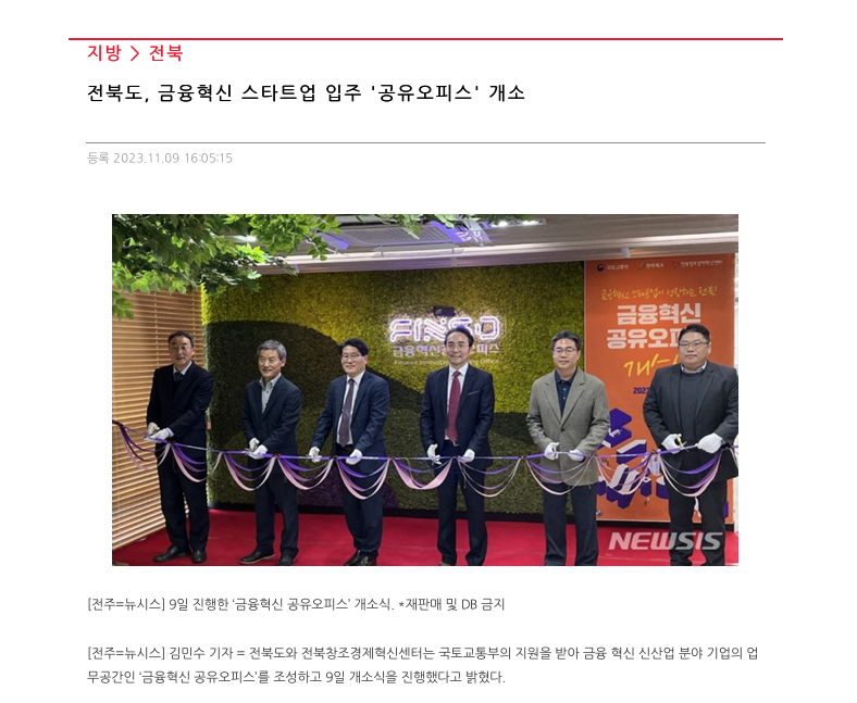 [뉴시스] 전북도, 금융혁신 스타트업 입주 '공유오피스' 개소(2023.11.09.)