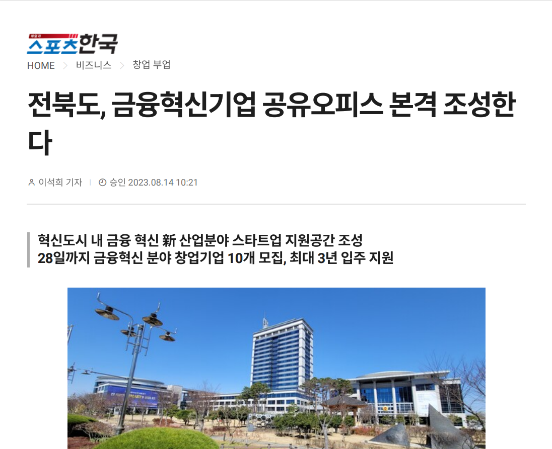 [데일리스포츠한국] 전북도, 금융혁신기업 공유오피스 본격 조성한다(2023.08.14.)