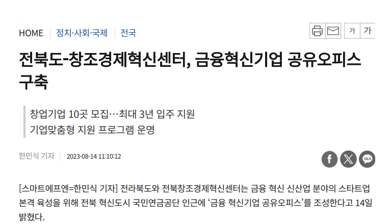 [스마트에프엔]전북도-창조경제혁신센터, 금융혁신기업 공유오피스 구축(2023.08.14.)